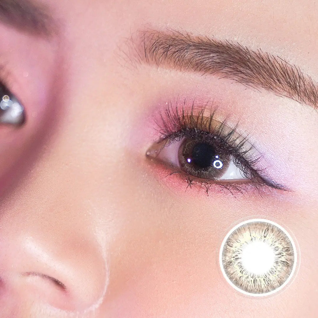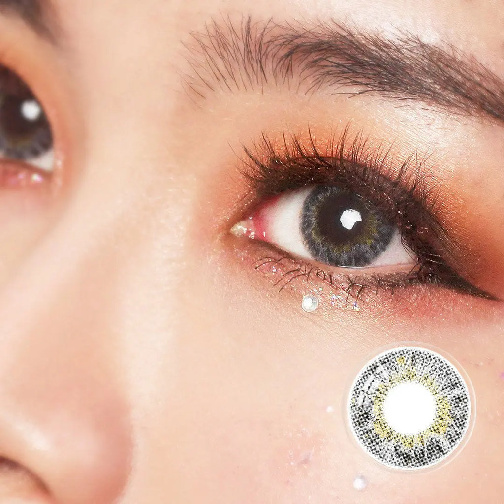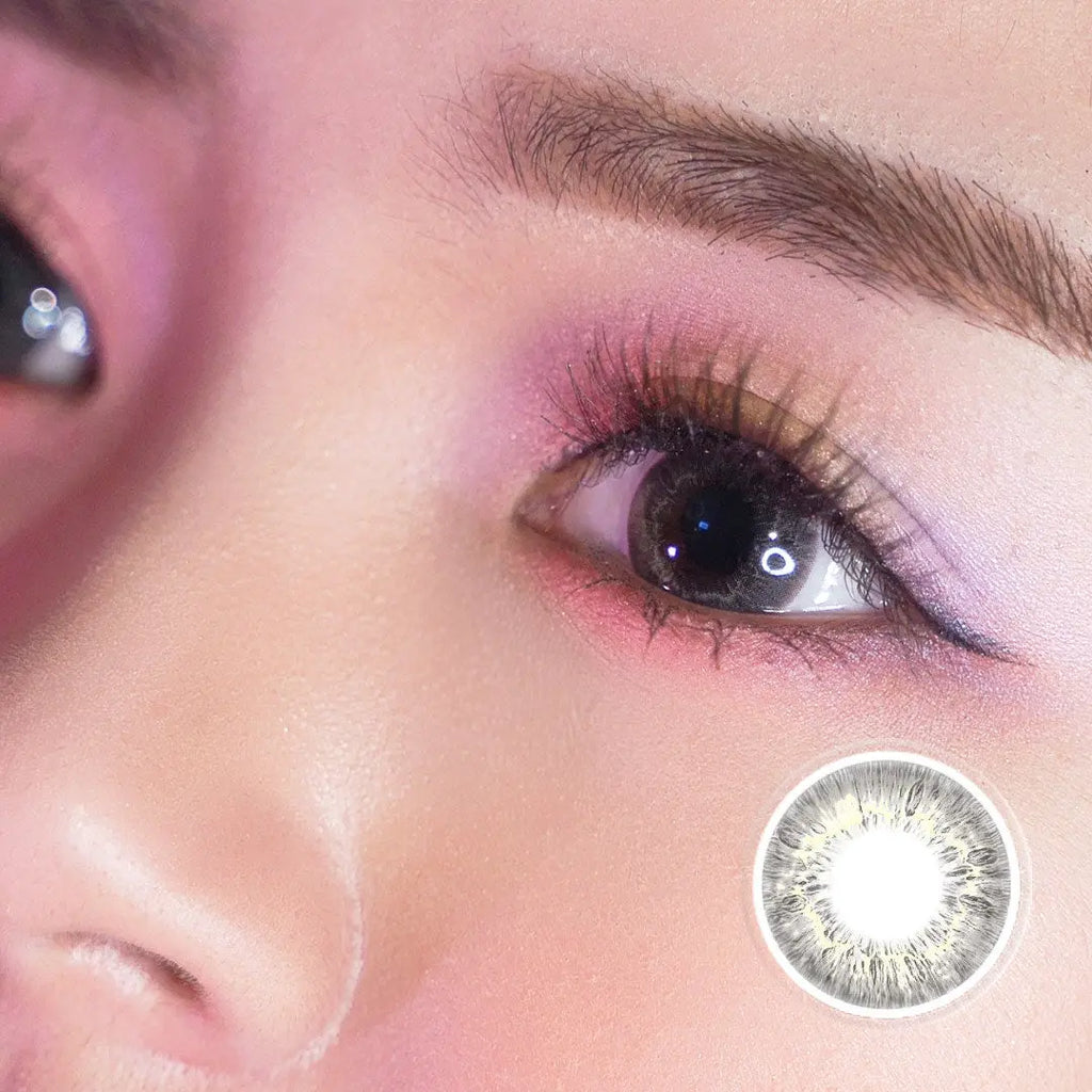 Close-up of a model wearing red color contact lenses with bold design, enhancing eye appearance for a striking and dramatic cosplay look.Close-up of a red colored contact lens with detailed design, resting on a reflective surface, ideal for cosplay or bold eye enhancements.