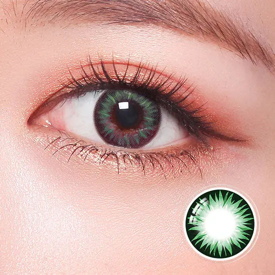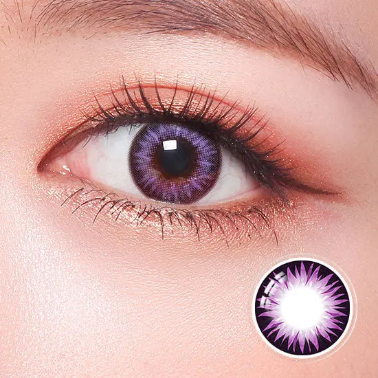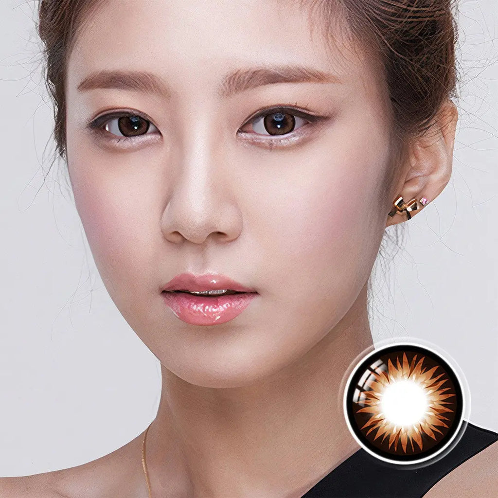 Close-up of a model wearing red color contact lenses with bold design, enhancing eye appearance for a striking and dramatic cosplay look.Close-up of a red colored contact lens with detailed design, resting on a reflective surface, ideal for cosplay or bold eye enhancements.