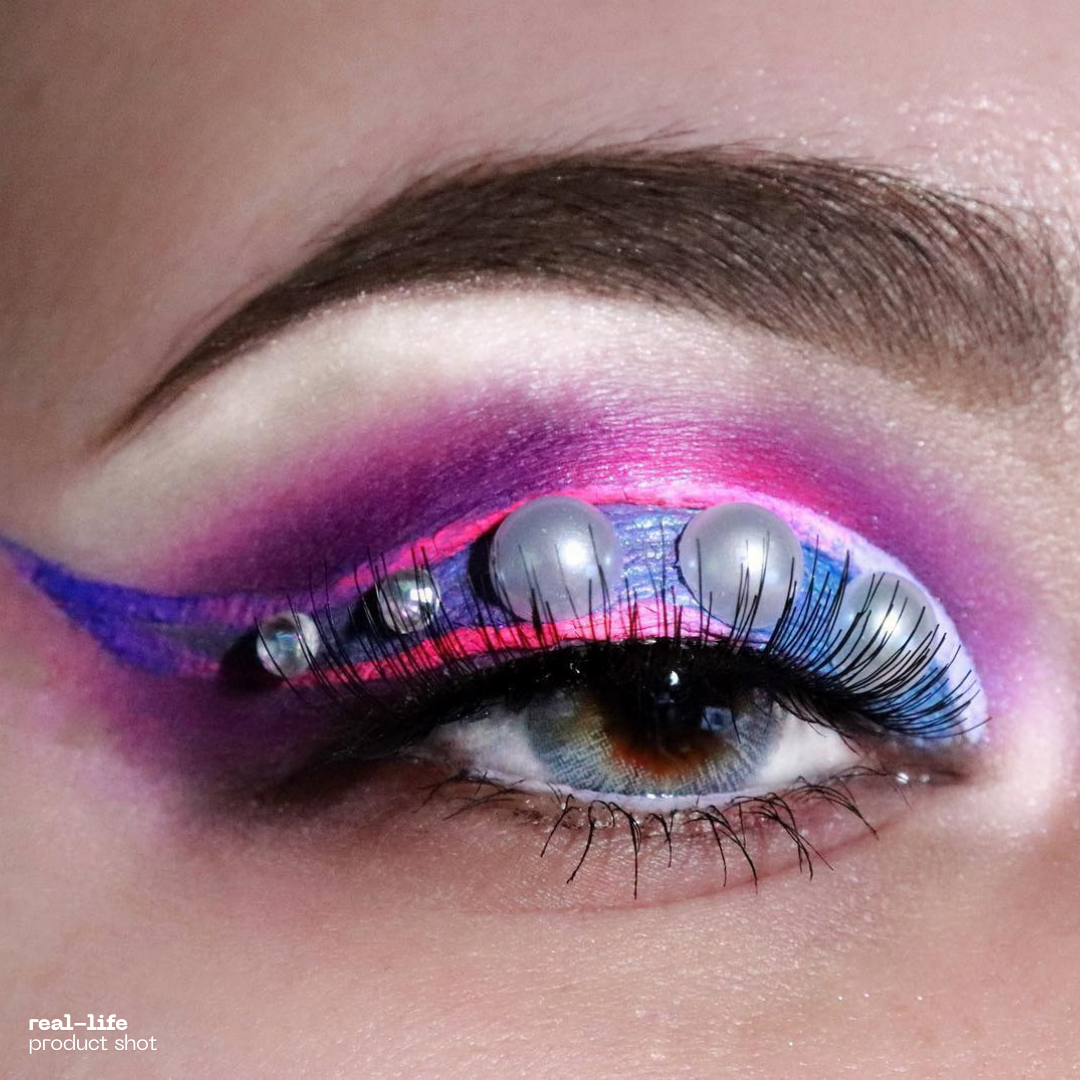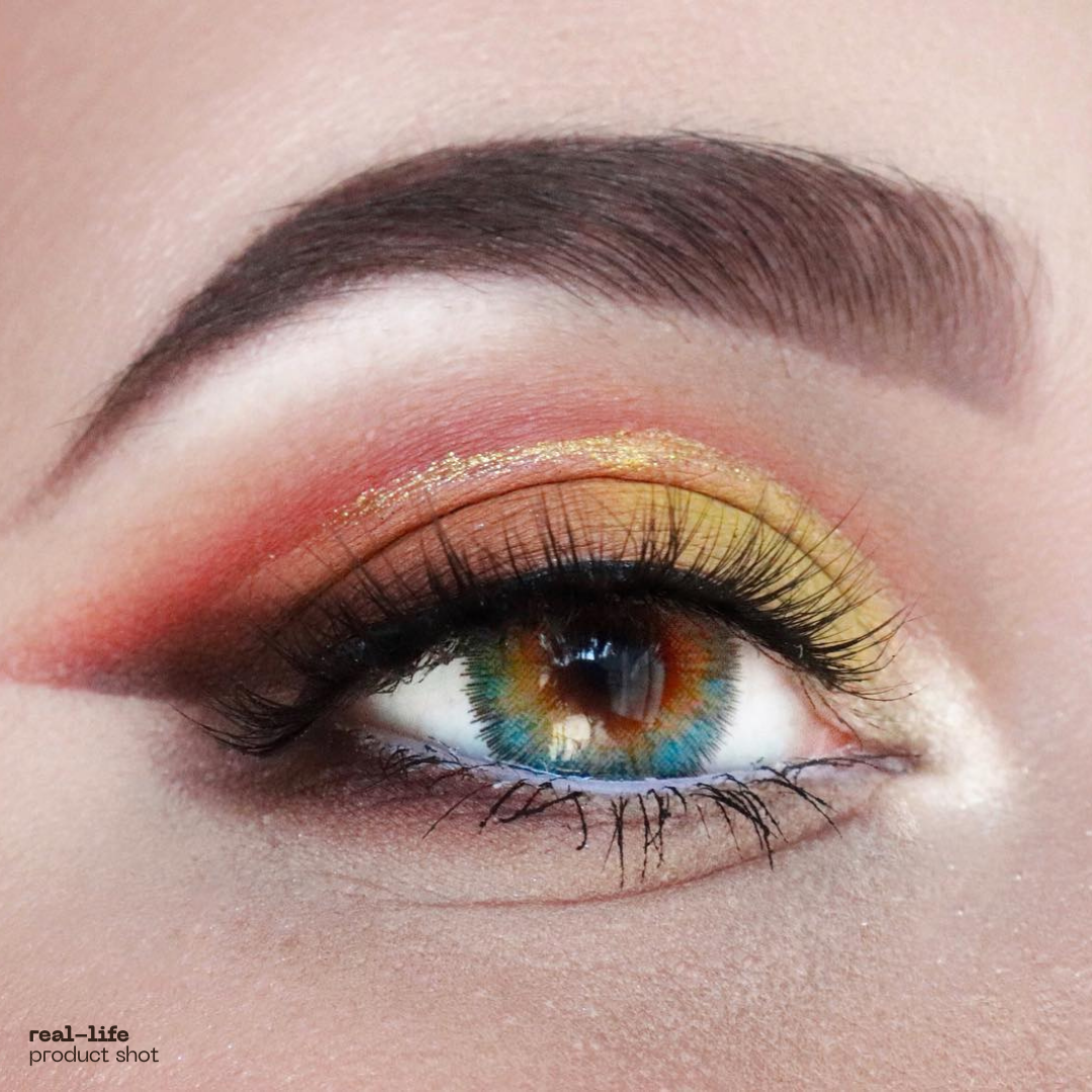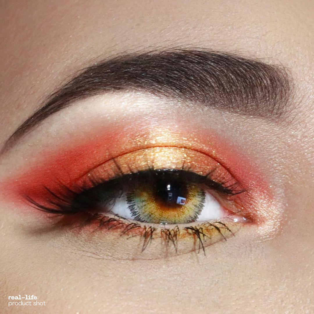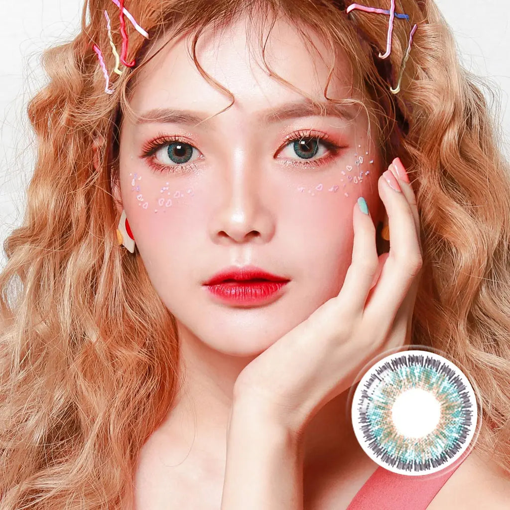 Close-up of a model wearing red color contact lenses with bold design, enhancing eye appearance for a striking and dramatic cosplay look.Close-up of a red colored contact lens with detailed design, resting on a reflective surface, ideal for cosplay or bold eye enhancements.