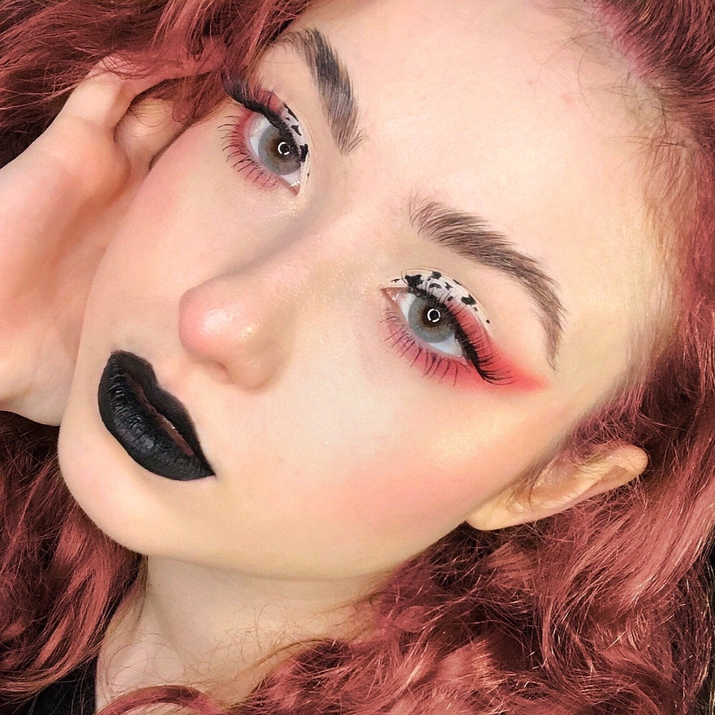 Close-up of a model wearing red color contact lenses with bold design, enhancing eye appearance for a striking and dramatic cosplay look.Close-up of a red colored contact lens with detailed design, resting on a reflective surface, ideal for cosplay or bold eye enhancements.