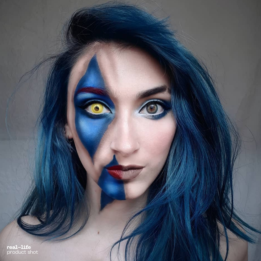 Close-up of a model wearing red color contact lenses with bold design, enhancing eye appearance for a striking and dramatic cosplay look.Close-up of a red colored contact lens with detailed design, resting on a reflective surface, ideal for cosplay or bold eye enhancements.