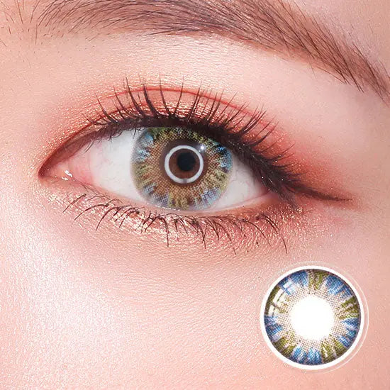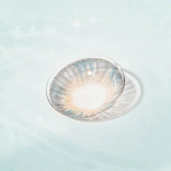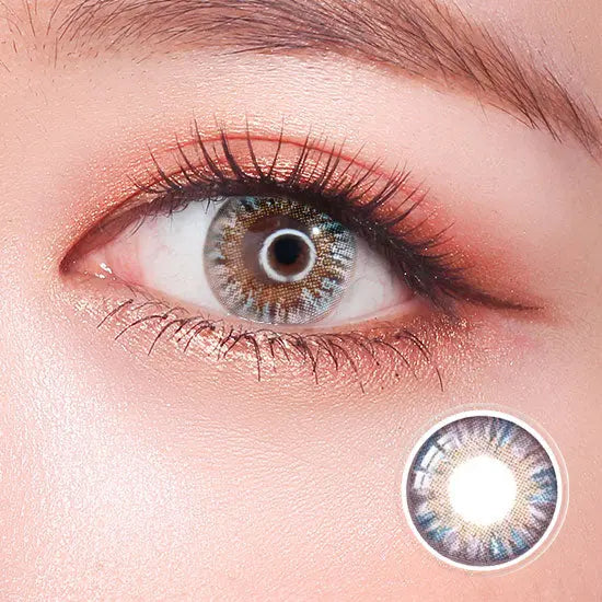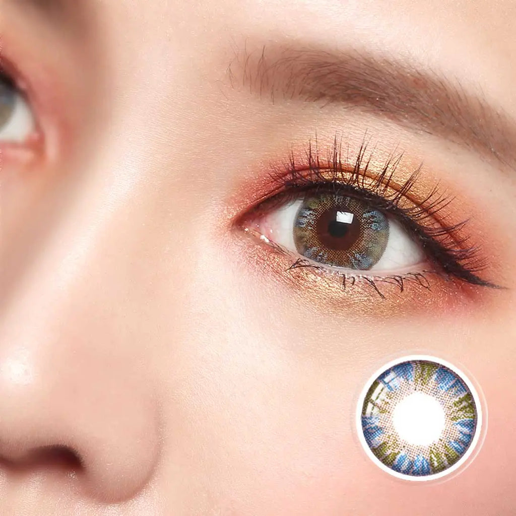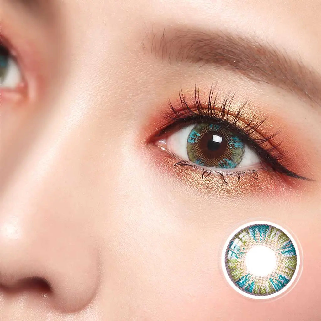 Close-up of a model wearing red color contact lenses with bold design, enhancing eye appearance for a striking and dramatic cosplay look.Close-up of a red colored contact lens with detailed design, resting on a reflective surface, ideal for cosplay or bold eye enhancements.